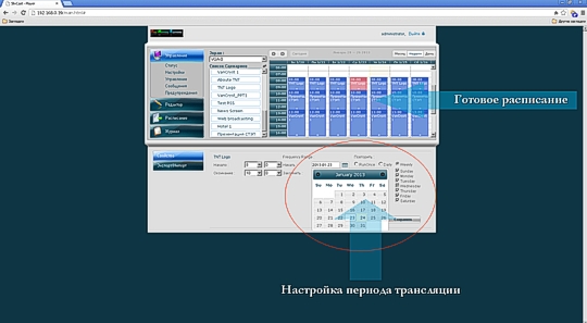 Для создания расписания необходимо просто перетащить нужный вам сценарий (видеоролик) на нужный день и задать ему время начала и окончания трансляции. Затем повторить действия со следующим сценарием и т.д..