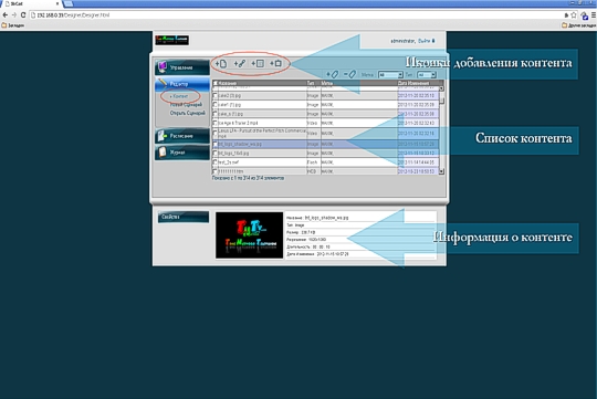 После того, как исходный контент загружен, можно приступать непосредственно к созданию видеоролика или Сценария в терминологии системы TNTv Digital Signage.
