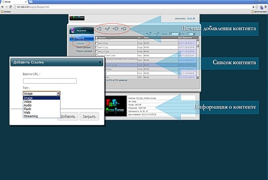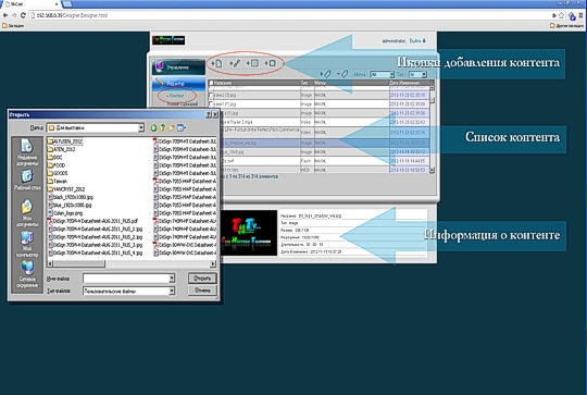 Загрузка файлов осуществляется очень легко: вы просто выбираете необходимые вам файлы (картинки, видео, анимации, музыку, HTML и PDF-документы и т.д.), находящиеся на вашем компьютере (или в корпоративной сети), и нажимаете кнопку «Загрузить». Выбранные вами файлы копируются во внутреннее хранилище контент-плеера.