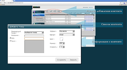 Для начала работы с контент-плеером вам необходимо подключить его напрямую сетевым кабелем к вашему компьютеру (ноутбуку) или подключить его к вашей офисной сети, затем зайти в браузер и набрать в адресной строке IP адрес контент-плеера, который он отображает на подключенном к нему дисплее после загрузки. Введя логин и пароль, вы попадете в консоль управления контент-плеером (встроенное в него программное обеспечение). Далее вся работа с контент-плеером осуществляется исключительно отсюда.