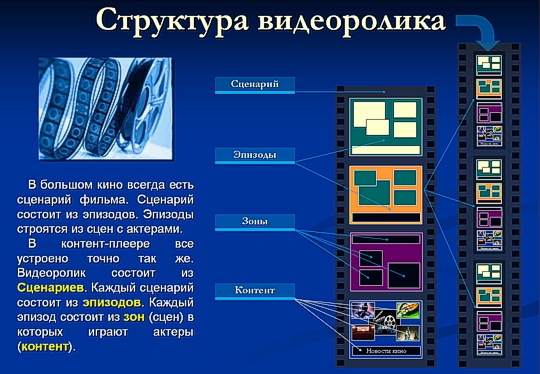 В контент-плеере все устроено точно так же. Видеоролик состоит из Сценариев. Каждый сценарий состоит из эпизодов. Каждый эпизод состоит из зон (сцен), в которых “играют актеры” — контент.