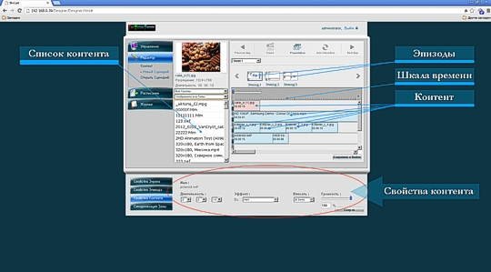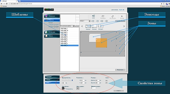 Эпизод создается очень просто. Сначала задается цветовой фон или фон-картинка. Далее на рабочем поле задаются области (зоны), в которых будет проигрываться исходный контент. Зоны могут иметь произвольные размеры, взаимное расположение (в том числе и с перекрытием) и параметры отображения контента в них (прозрачность, цвет фона, ширина и цвет рамки и т.д.).
