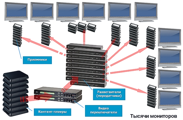 Централизованные схемы сложнее в построении, так как в них помимо источников видеосигналов и устройств отображения применяются также устройства для коммутации и передачи видео. Это различного рода коммутаторы, разветвители, удлинители и т.д. Все эти устройства необходимы для того, чтобы правильно скоммутировать и передать видеосигнал от источников изображения (компьютеров, DVD-плееров, контент-плееров и т.д.) к нужному количеству расположенных в нужных местах устройств отображения (мониторов, телевизоров, проекторов, видеостен и т.д.).