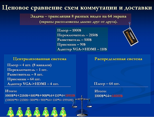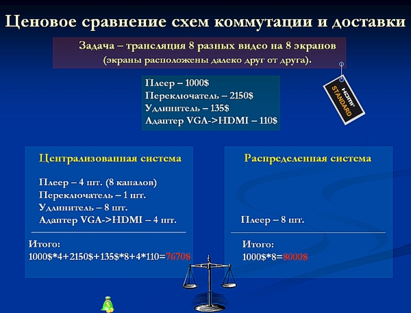 При использовании устройств, аналогичных контент-плеерам TNT, но не имеющих двух каналов трансляции, с существенным перевесом победит распределенная схема, так как в данной задаче никаких дополнительных устройств для передачи видеосигналов от источников к устройствам отображения не требуется (они будут избыточными), а количество источников трансляции (с разным контентом) равно количеству устройств отображения.