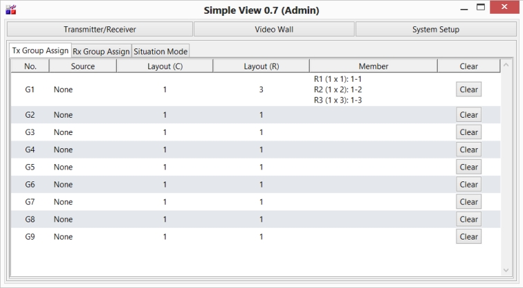 Далее необходимо задать размер видеостены (поля "Layout (C)" и "Layout (R)"), ее области отображения (поля "G1"-"G9") и источники видеосигнала (поле "Source") для каждой из областей.