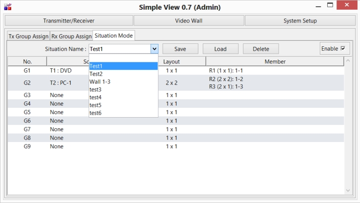Управление видеостеной очень простое. Можно просто менять источники сигналов, транслируемых на ту или иную область видеостены, а можно менять и режимы работы видеостены (менять число, размер и положение областей отображения), сохраняя потом эти настройки в виде шаблонов. Впоследствии эти шаблоны можно активировать в нужные моменты времени. Активируется шаблон просто — он вибирается из списка, и нажимается кнопка "Load". После этого шаблон мгновенно активируется.
