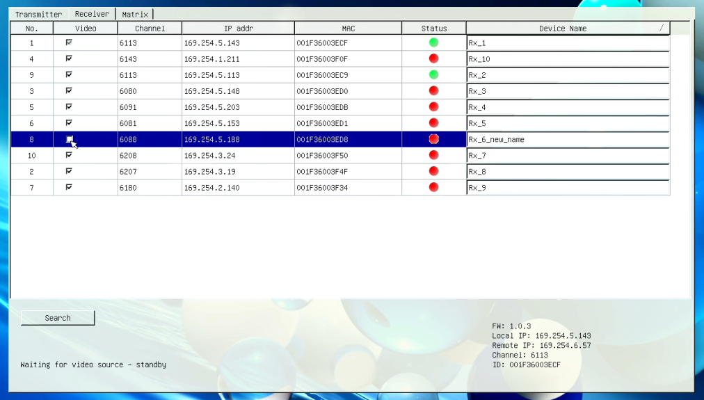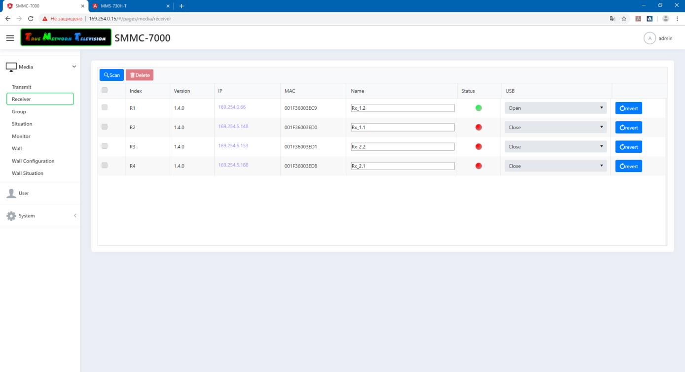 При помощи экранного меню администратор сможет давать имена источникам и потребителям, контролировать в реальном времени состояние трансляции и транслируемый источниками контент, производить необходимую коммутацию, а также физически включать/выключать трансляцию (отключать видеовыход) на приемнике.