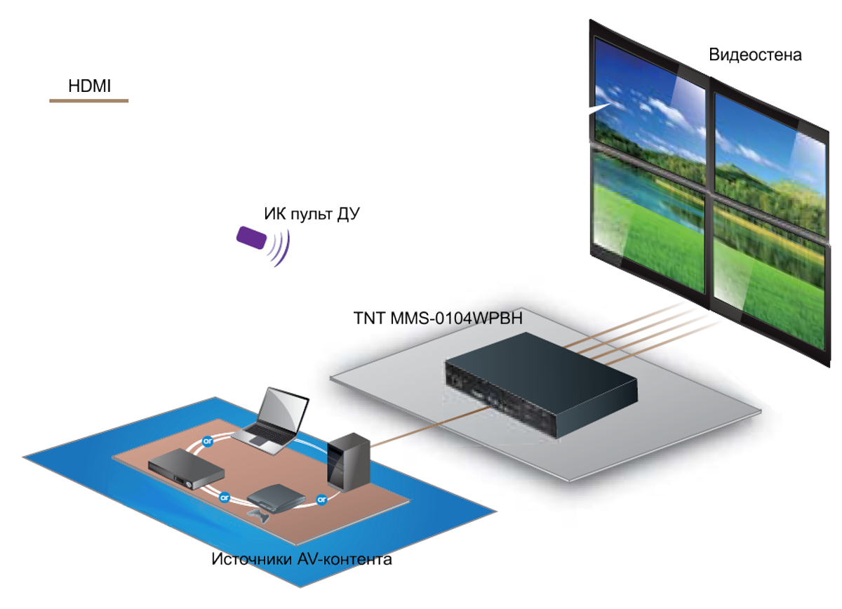 Решение позволяет подключить к видеостене три независимых источника видеосигнала с интерфейсами HDMI, VGA+аудио и DVI-D. При необходимости источники можно быстро переключать при помощи ИК пульта ДУ.