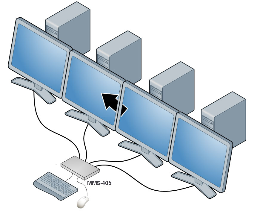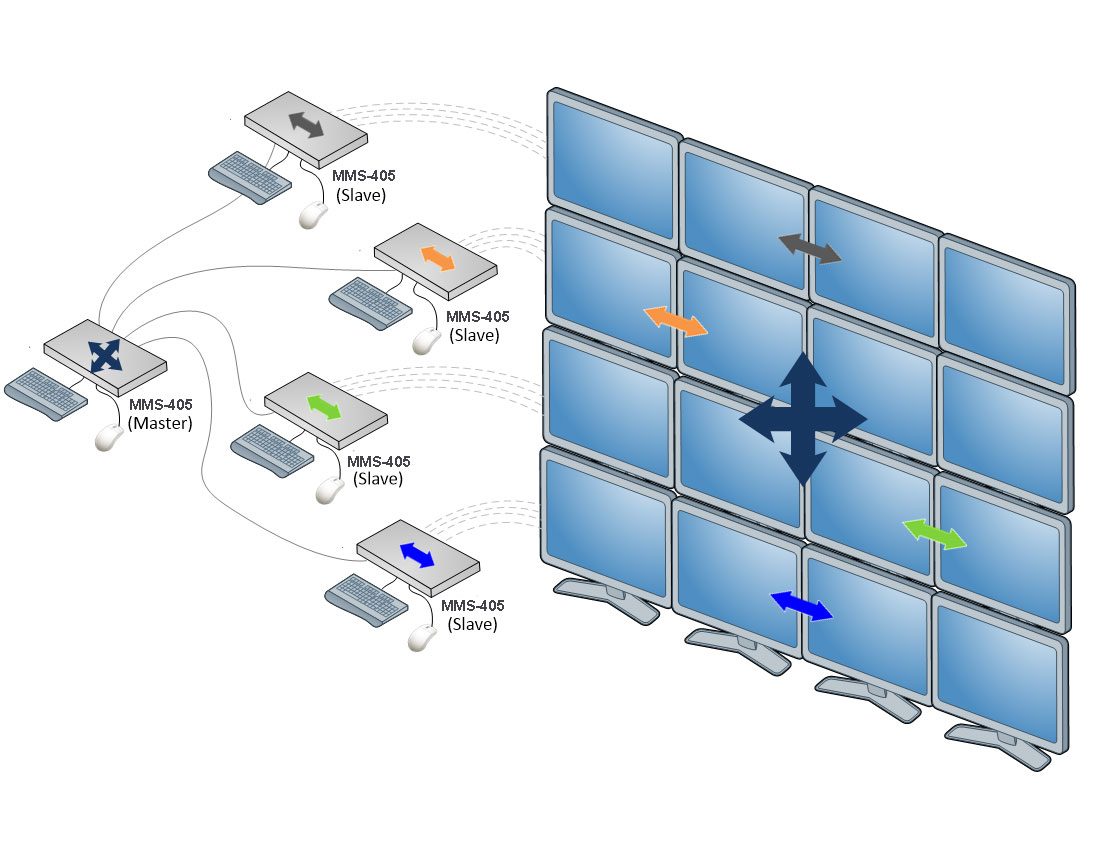 KM-переключатели MMS-405U могут каскадироваться, что увеличивает количество управляемых с одной консоли рабочих станций до 16. Переключение между рабочими станциями может осуществляться при помощи горячих клавиш, а также просто перемещением мыши между экранами - функция "Free Flow". В режиме "Free Flow" оператор просто перемещает курсор мыши в сторону нужного экрана, а переключатель автоматически переключает клавиатуру и мышь на необходимую рабочую станцию.
